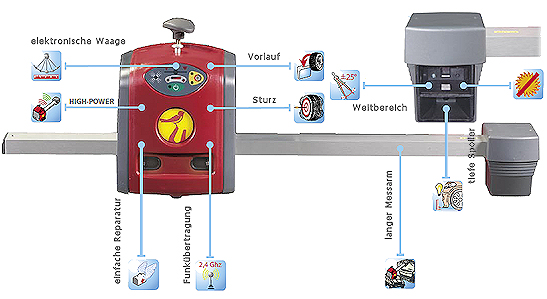 3D-Technik: Das Achsmessgerät arbeitet mit der wirklich räumlichen Vermessung der Fahrzeuge. Die innovativen Reflektoren BlackTag und die digitale Visiontechnik NIR (Near InfraRed) stellen das Achsmessgerät BlackTech an die Spitze seiner Art.